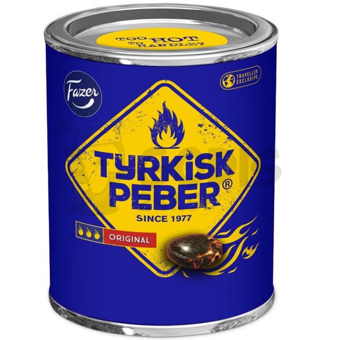 Fazer Tyrkisk Peber är en klassiker med het lakritsmak som har fått alla saltlakritsälskare att bli eld och lågor sedan 1977. Inuti ursprungliga Tyrkisk Peber Originals hårda saltlakritsskal döljer sig ett eldigt saltlakritspulver. Påsen innehåller en precis lagom stor utmaning för dina smaklökar – bjud även kompisarna! Den snygga plåtburken är en perfekt present till alla saltlakritsälskare. Passar även veganer.