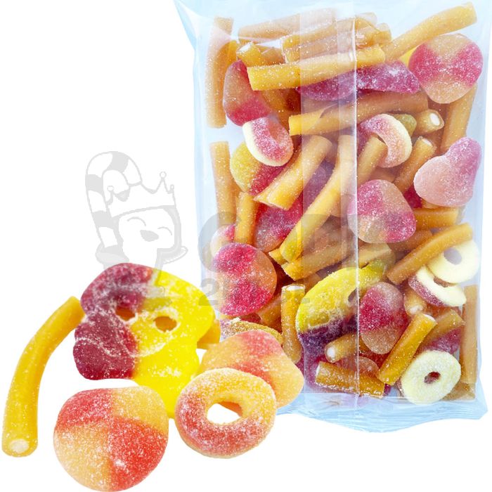 Ingredienser: Socker, VETEMJÖL, glukossirap, vatten, modifierad stärkelse, gelatin, pektin, vegetabiliska oljor (kokos, shea), ytbehandlingsmedel (schellack), surhetsreglerande medel (mjölksyra, fumarsyra, citronsyra, natriumcitrat), fuktighetsbevarande medel (glycerol), naturliga smakämnen, frukt- och grönsakskoncentrat (rädisor, morot, svarta vinbär, vindruvor), emulgeringsmedel (mono- och diglycerider av fettsyror), färgämnen (E100, E120, E120A, E160C, E163).